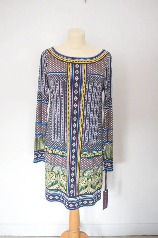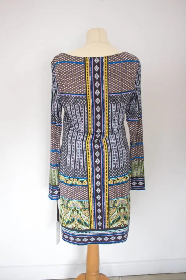 The 6518 dress by Hale Bob is a straight cut slim-fitting round neck style with long sleeves. Slips on over the head. Multicolour graphic print. Lined with Hale Bob’s much-loved mesh for extra comfort and fit.