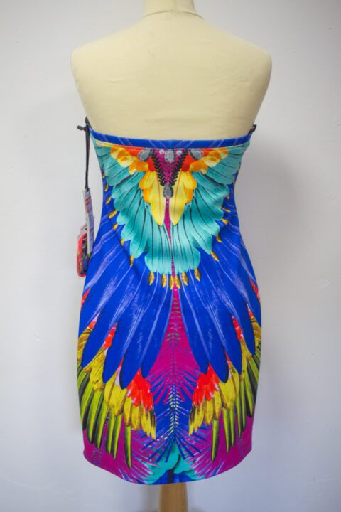 The 6686 dress by Hale Bob is a stretchy strapless bodycon style in a striking cobalt blue and multi-colour feather print. A true statement piece for the summer.