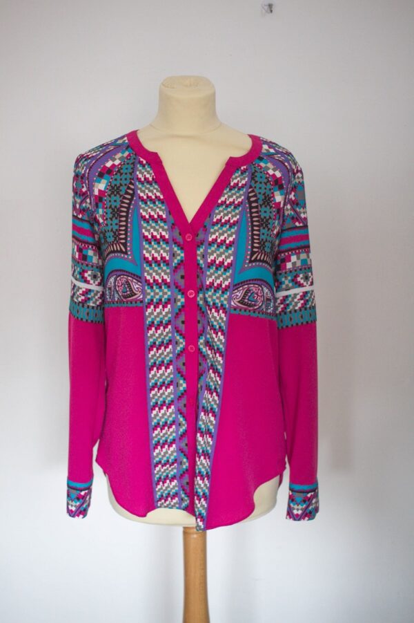 The 2511 Long Sleeved Blouse by Hale Bob is a bright and cheerful style with v neckline and button front. Geometric print contrasts with raspberry base colour. A gorgeous piece to liven up your wardrobes!