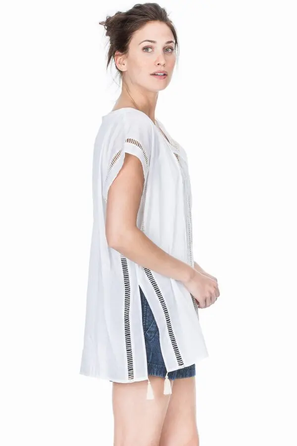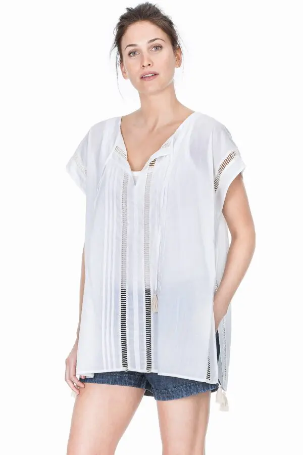 This gorgeous cotton caftan will keep you cool – wide fitting style with drop cap sleeve and v neckline with tie. Openwork detail gives this piece interest making it a lovely easy-wear choice for the summer.