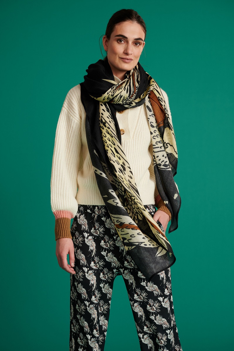 Feel free like a bird! This rectangular scarf with birds of paradise is easy to combine with different outfits because of the neutral colours black, white and brown. The large scarf is rectangular and made of Modal and wool.