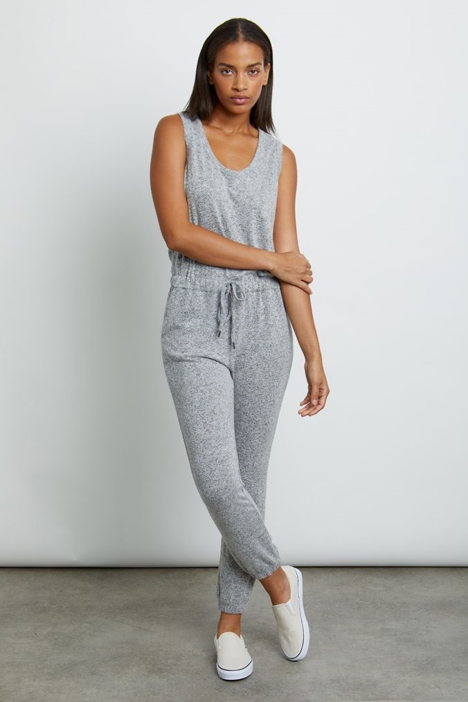 Our edit of the collection brings you some gorgeous casual pieces. Here we have the Becky, a lounge jersey, sleeveless, melange grey relaxed tank jumpsuit. Featuring scoop neckline, front pockets, and concealed drawstring waist ties this style is fitted through hip, slim straight leg, full-length inseam, and has elastic cuff at hem. This super soft pull-on style is perfect for everyday comfort.