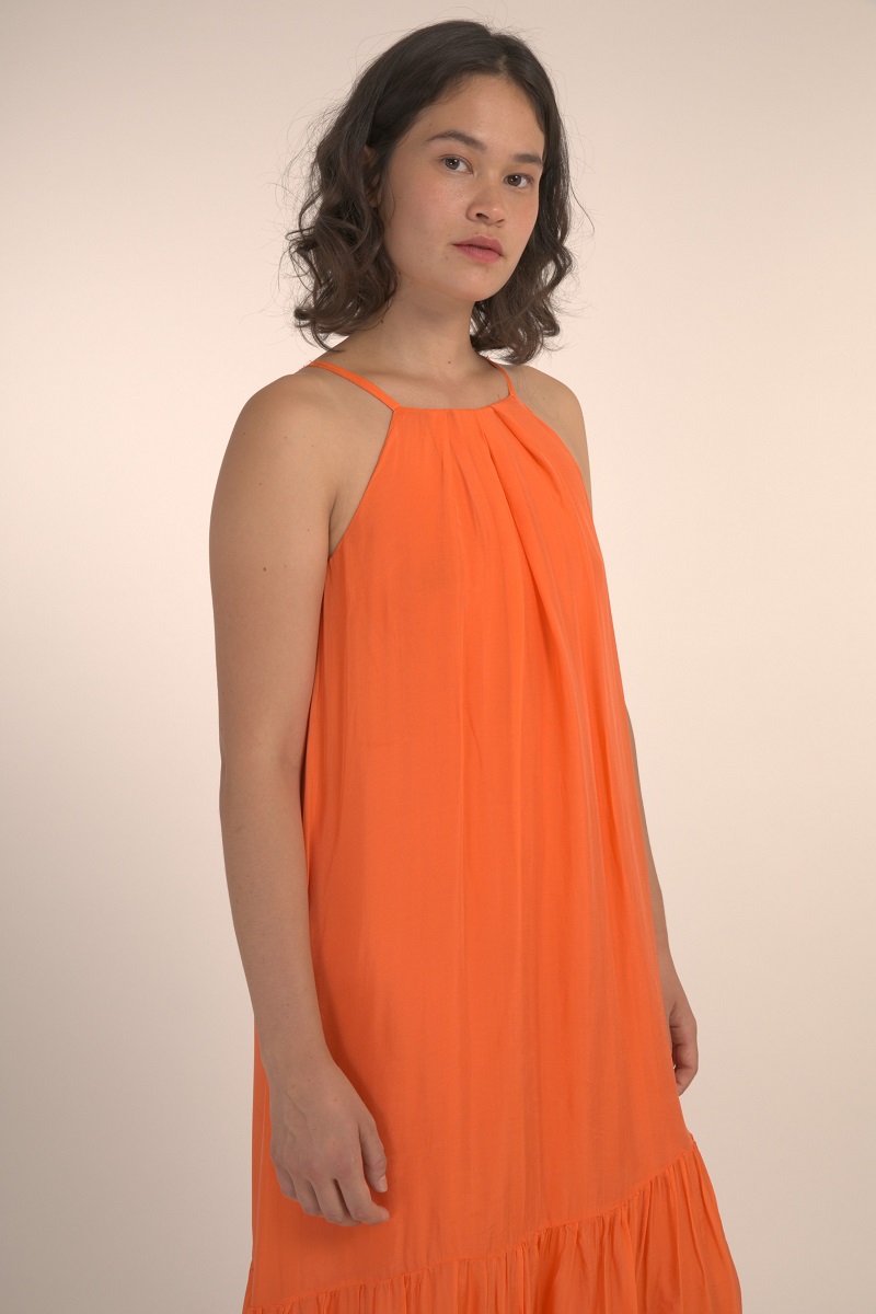 Keep it simple with the Atika dress. Playing on volume, the loose cut, both bohemian and modern, is enhanced by a ruffled hem giving extra movement. At the back, thin straps extend into a pretty halter top that gives it an extra lightness. An airy and easy-going dress, perfect for hot summer days.