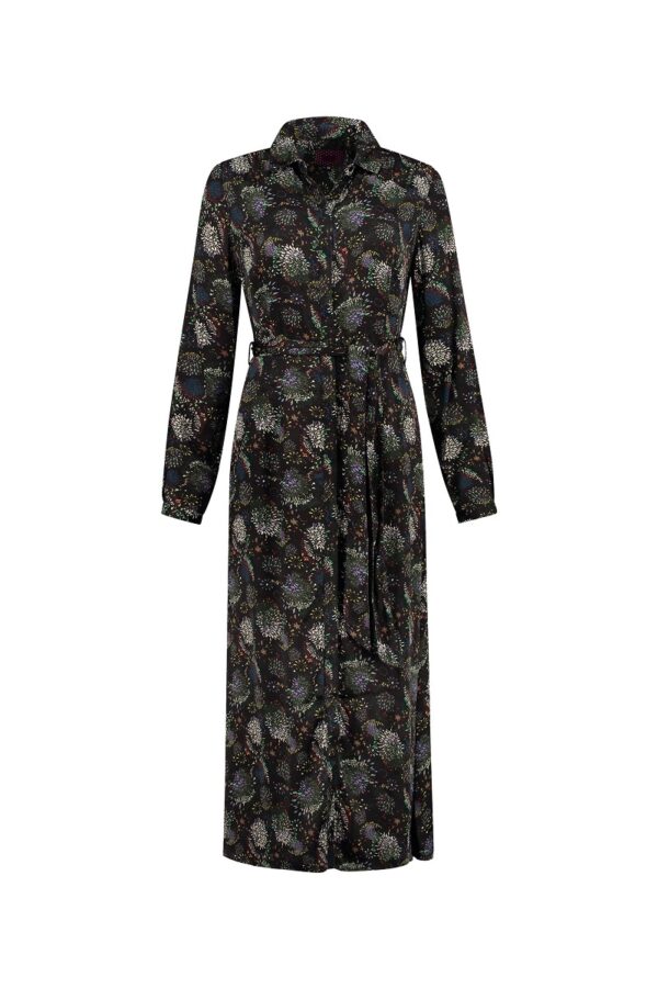 This midi dress evokes a painting of fireworks on a bright New Year’s Eve! The dark background with fireworks print makes the colours shine! Lavender, ecru, green and red: you won’t get bored. In viscose with a collar and buttons to the front. Straight cut style with long sleeves and self-fabric tie belt.